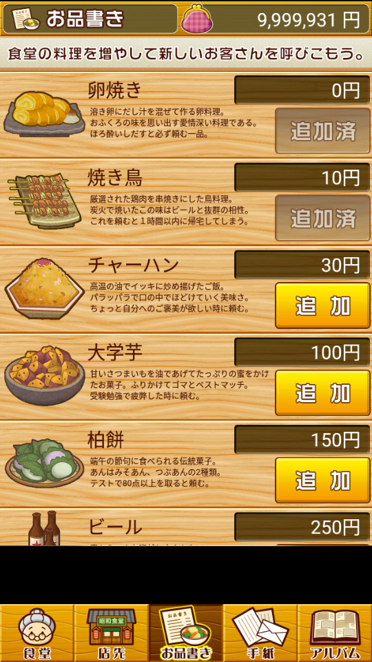 游戏的玩法流程很简单,通过点击料理按键,消耗一定的硬币,老奶奶就会在选择的时间内不停地制作料理,吸引客人前来上门,玩家只需轻轻点击客人就可以收到硬币了。除了店内回来客人,店门前也会时不时掉落一些小物品,例如奶糖、柠檬粉等这些充满了昭和年代印记的商品。通过点击回收这些物品,也同样可以获得硬币哦。