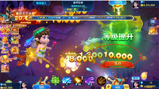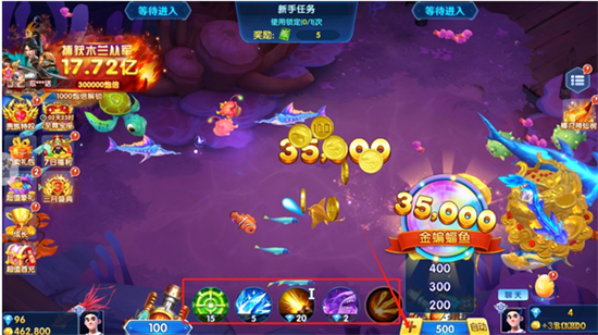 4、遭遇防御高、血量厚的BOSS级巨鱼时,建议及时提升炮台等级,并配合使用冰冻减缓游速、狂暴增强火力、锁定追踪目标等强力辅助道具,提高击杀成功率。