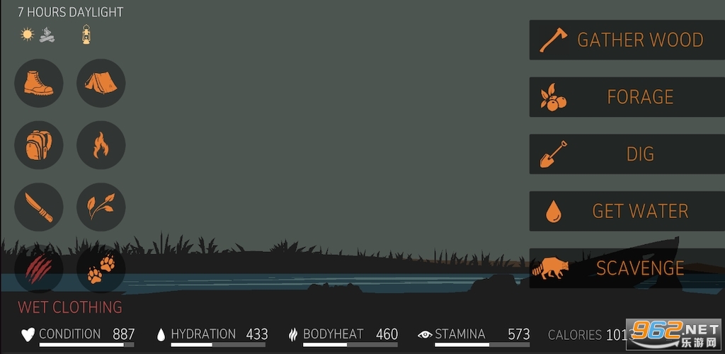 尝试生存并前往安全的地方。以荒野生存为主题的模拟游戏,你需要决定如何度过你的时间,以及为了生存现在对你来说最重要的行动:建造避难所、寻找食物、水、旅行、收集木柴。