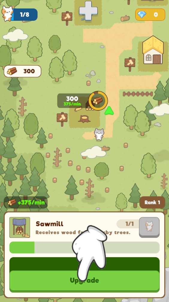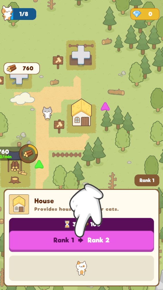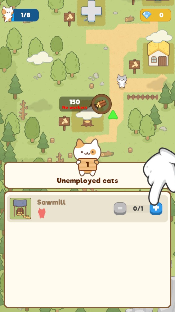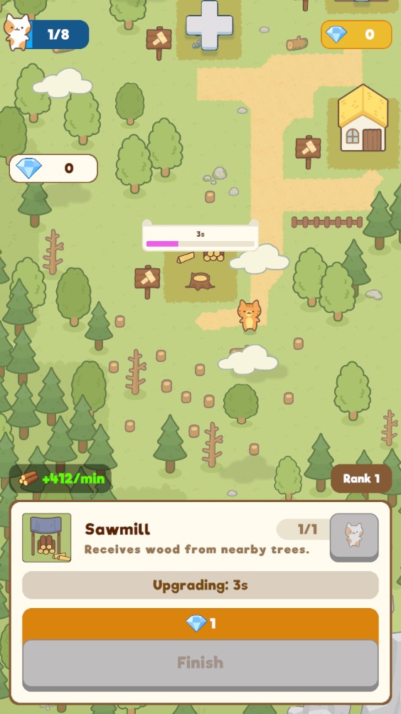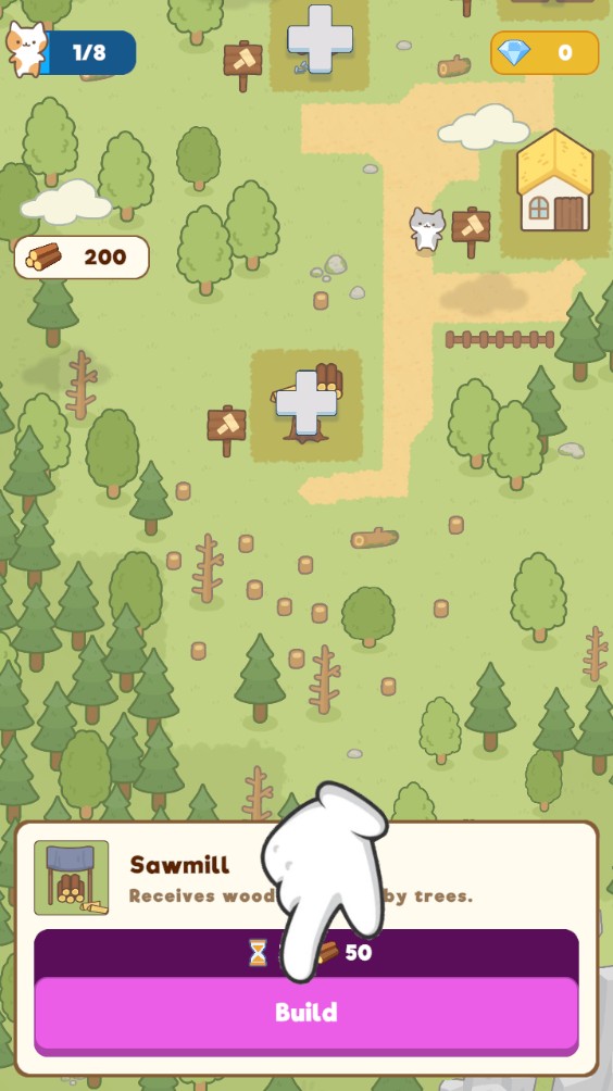 2、你可以砍伐周围的树木获取木材,并用这些材料来扩展和建设你的猫咪城镇。