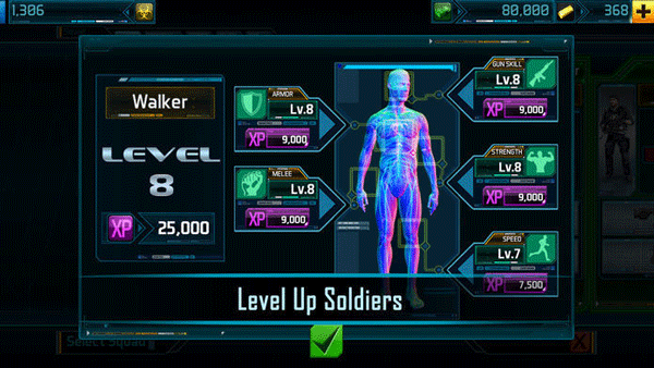 在执行任务的过程中我们有一定的几率可以捡到科技点以及金钱。金钱是用来购买直升机、队员以及武器的。升级武器就需要使用到科技点了。当现在的武器升级满之后,你就可以解锁下一把武器了。当然玩家也可以使用金钱购买装备包裹以及其他型号的直升机还有超级战士。