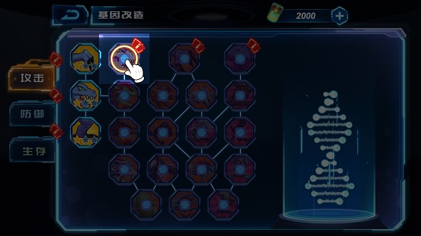 进入基因改造系统,分别有攻击、防御和生存三项天赋选择,在每一项的天赋选择中,玩家都能通过基因改造来强化机甲的战力。