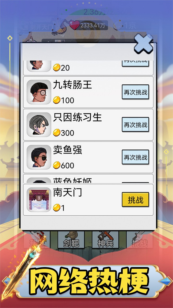 最牛剑客游戏玩家通过点击屏幕在控制游戏角色的攻击,屏幕点击的越快,角色攻击速度就越快。游戏中可挑战各种NPC,如:保安,九转肠王,强哥,水果葫芦娃等等比较有梗的角色。玩家在游戏中需要不断的挑战各种剑道高手,不断的提升自己的剑术,让自己变得更加强大,成为最牛的剑道高手,还有很多魔性搞笑的设计,为玩家带来全新的游戏乐趣。