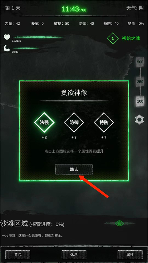 2、进入游戏界面可以选择法强、防御和特防其中一个属性进行提升,点击【确认】即可,完成当前行动后会前往下一区域,
