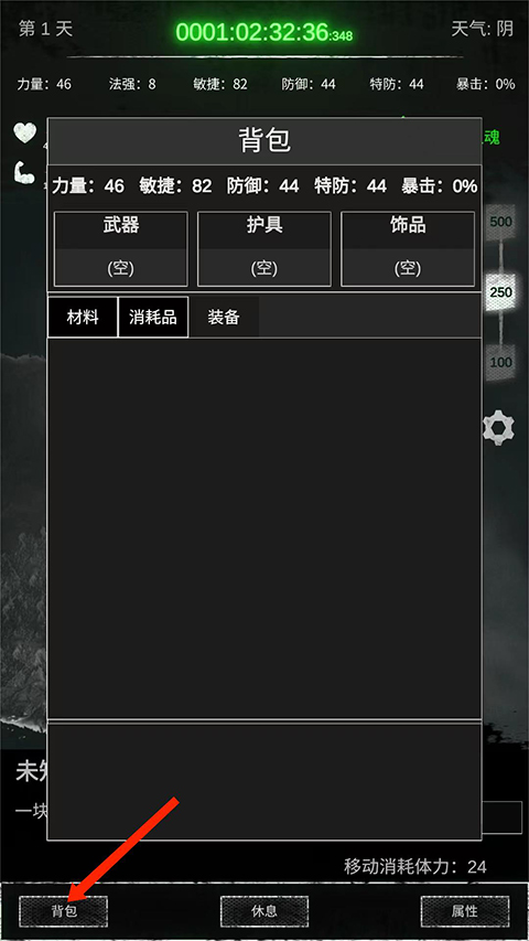9、选择左下角【背包】选项,可查看拥有的材料、消耗品和装备,