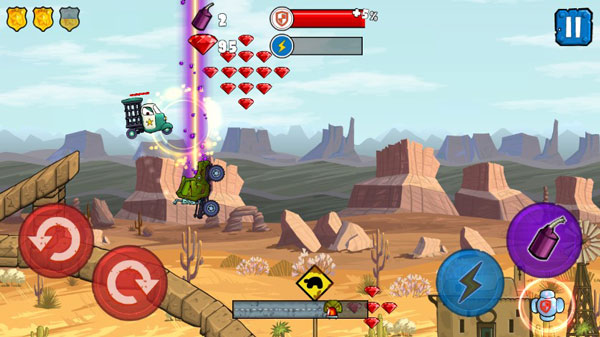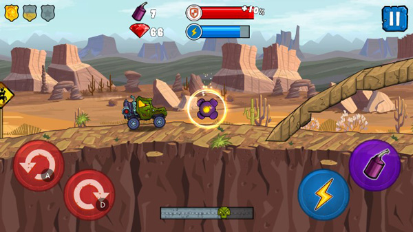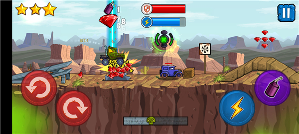 针对于游戏的玩法来说,其实还是比较简单的,左侧主要控制着赛车的重心,右侧以加速和炸弹释放为主,期间关卡中还有许许让每一关都尽显特色。