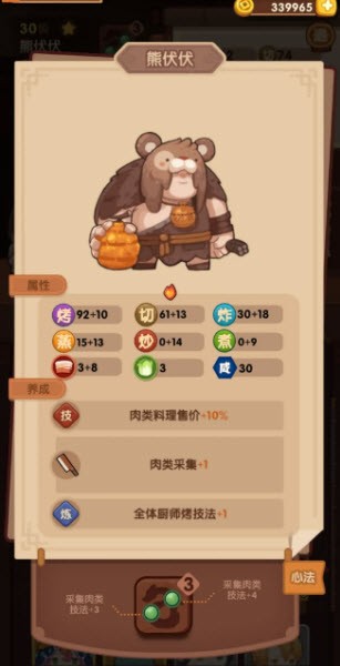 2、采集能力:专精于3种菜肴与3种肉类食材的处理。