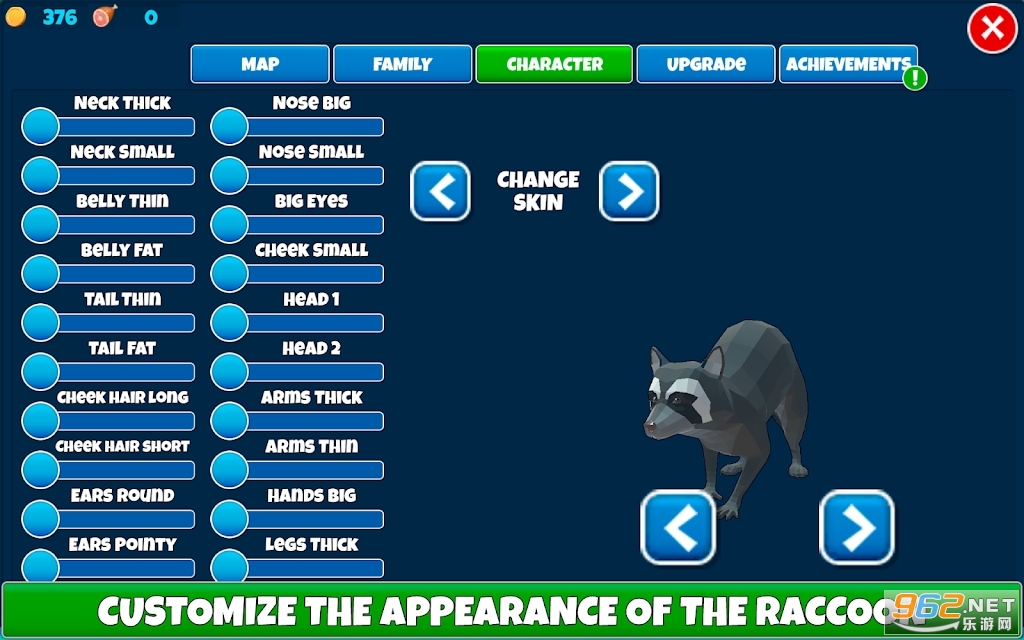 自定义浣熊的外观。根据您的喜好自定义角色的外观。您可以为您的角色选择不同的皮肤。你的浣熊有很多设置来控制它的外观。