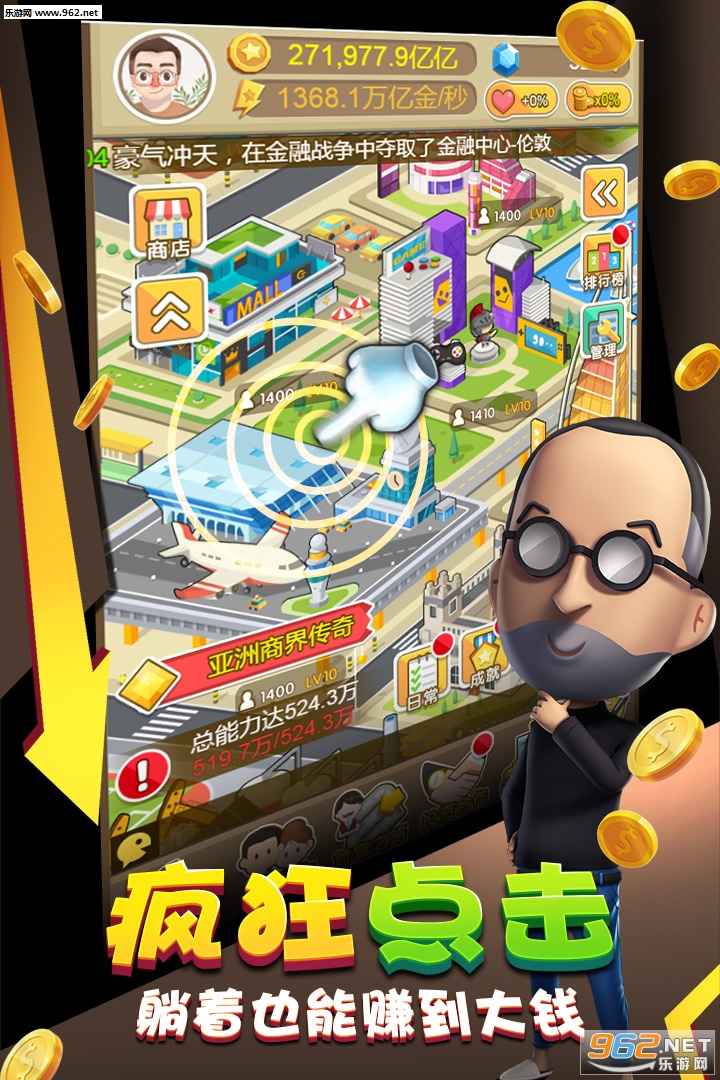 1、从零开始的手游,白手起家,依靠点击获得启动资金,慢慢投资各大商铺,赚取更多金币,来扩大的规模;