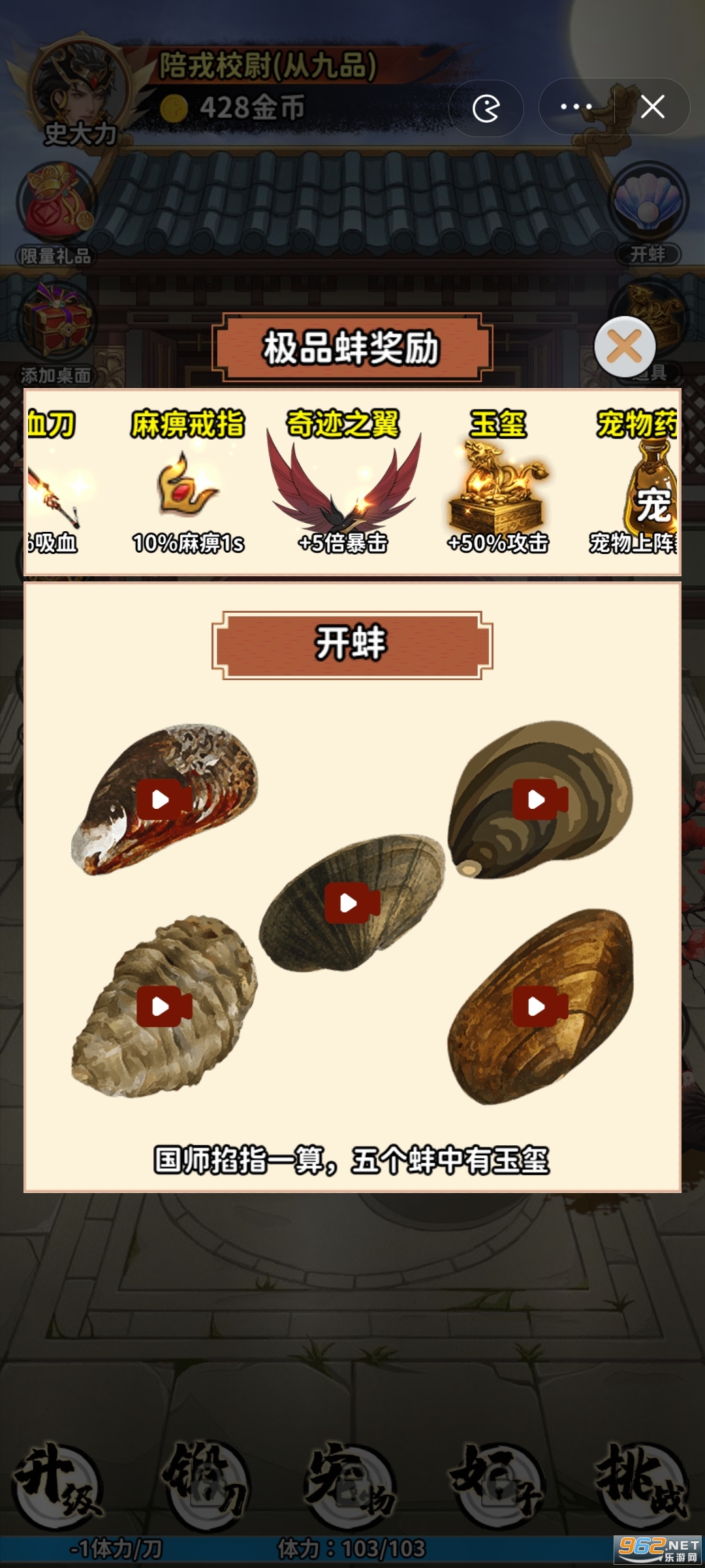 开蚌玩法:在开蚌中可以获得极品装备和各种有用的道具。