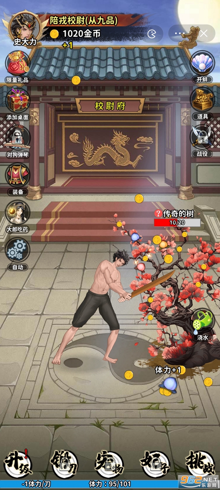 讲述一个现代人穿越到古代,然后开启了传奇大将军的一生,核心玩法就是砍树,然后挑战敌人,打赢以后升官,然后还可以锻造更强力武器,孵化更强力的宠物,达到(致果校尉)以后开启妃子侍寝功能,可以通过侍寝获得子孙,然后获得的子孙可以去发动战役,去打仗,打赢以后会有丰厚的奖励。达到官职传奇大将军以后会开启后宫功能(这个暂未开放)。
