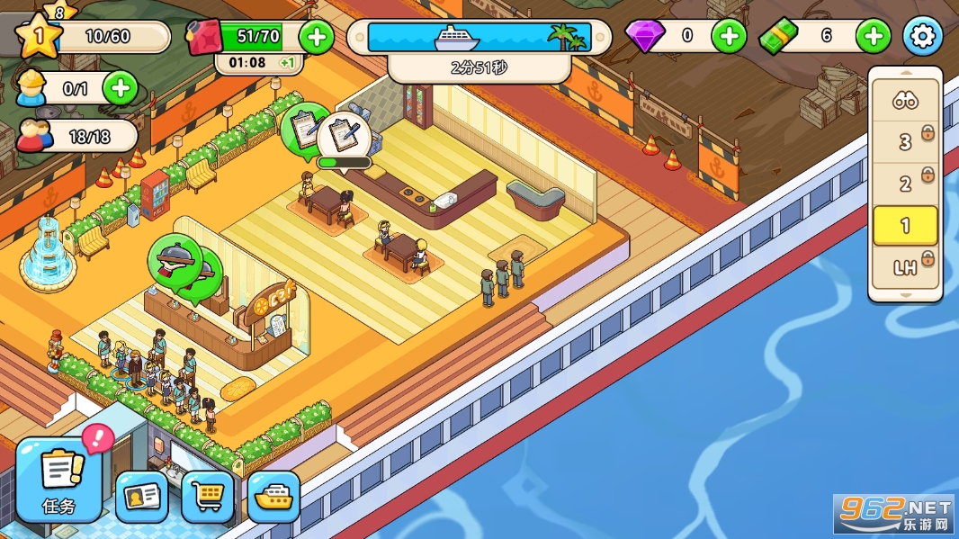 4.升级你的游轮,为他们提供最好的服务,打开他们的梦想假期,提高你的声誉。这是一个繁荣的移动城市。