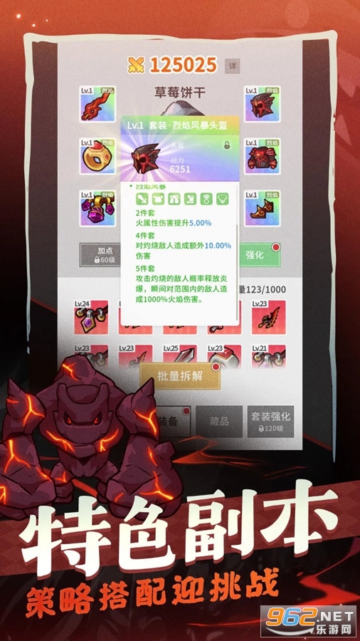 2、各种各样的装备等你去搭配体验,不同的套装效果会给你不一样的闯关乐趣。