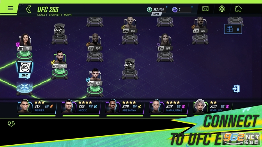 解锁并升级自己最爱的斗士,提升他们的力量。每个斗士都有独特能力的综合格斗组合,会随着斗士升级而解锁并提升力量。参加战役、副本,参与直播及特别赛事,赢取游戏内奖励。只要拥有击倒对手的意志,无论是新手玩家还是老牌拳迷都可以获得运动的荣耀。