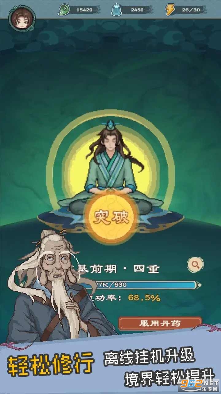 5、修行界面可以自动挂机,挂机升级就可以去知天阁买更好的符号和法器。