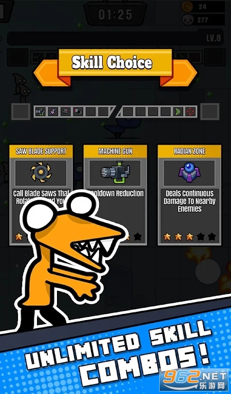 在战场上引导你的二头蛇英雄并升级技能以在僵尸浪潮中生存