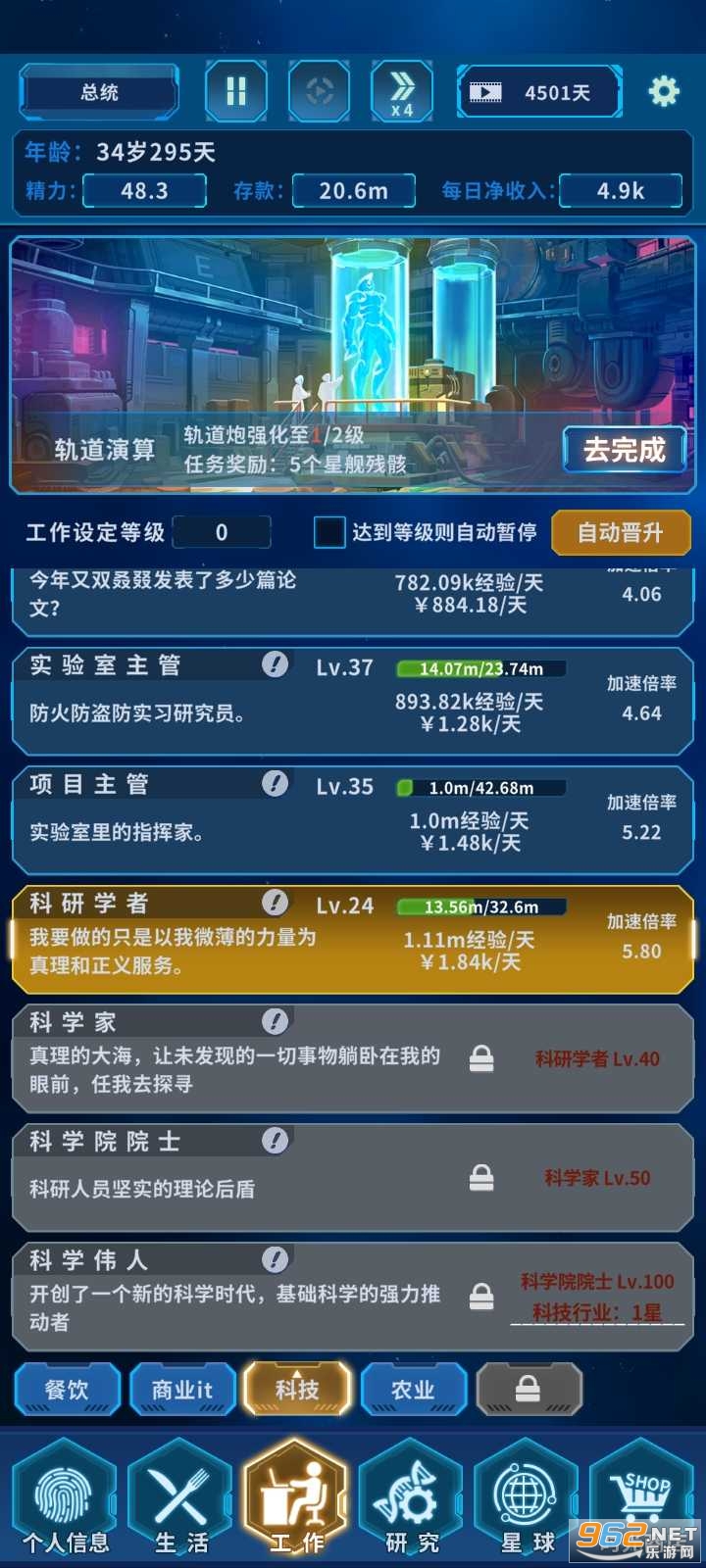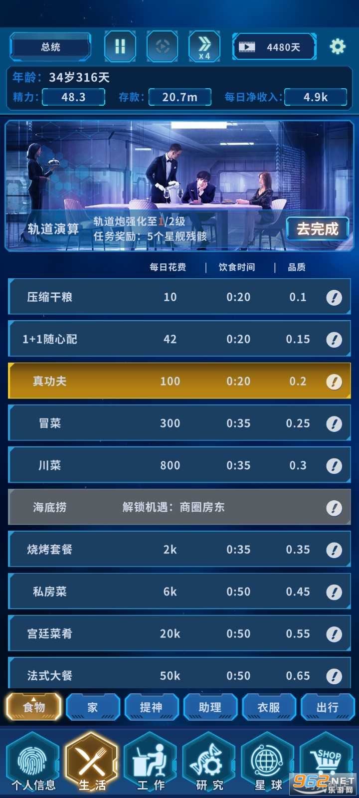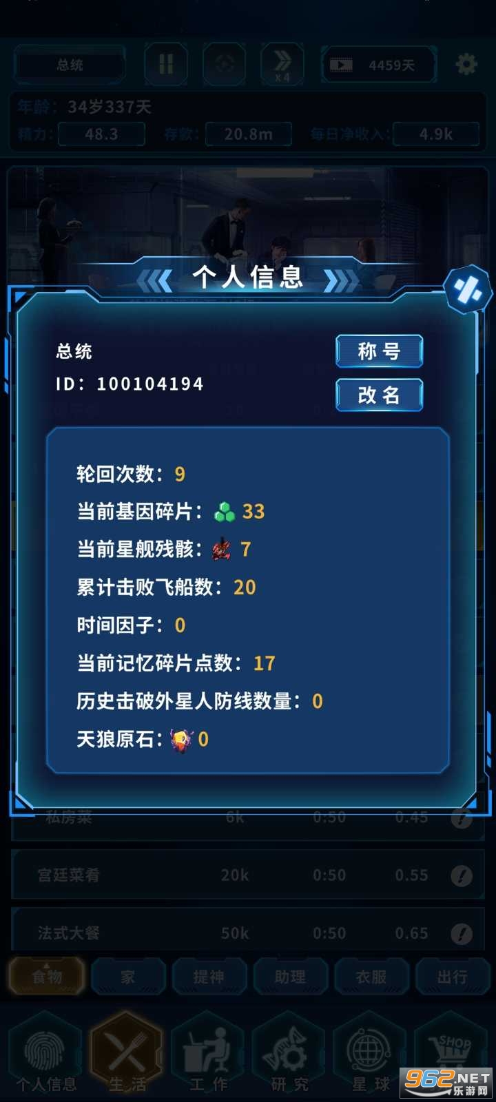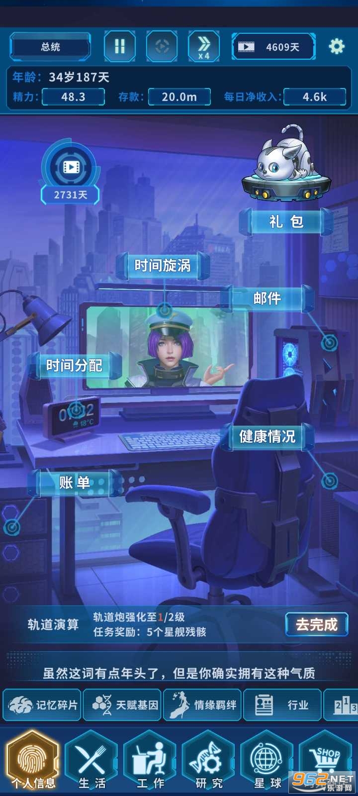 是一个模拟黑洞吞食文字科幻手游,科研人员在里面研究人体的大脑。游戏属性为年龄、精力、每日净收入、存款,有个人信息、生活、工作、研究、星球、时光商店。研究人体每日消耗的私房菜、法式大餐、烧烤套餐、冒菜、川菜等,游戏特效和内容非常有科技感哦。