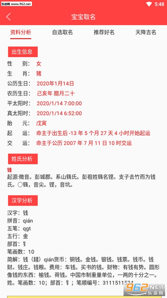 2、一键智能起名解名,八字排盘,分析名字数理,方便快捷挑选高分吉名。