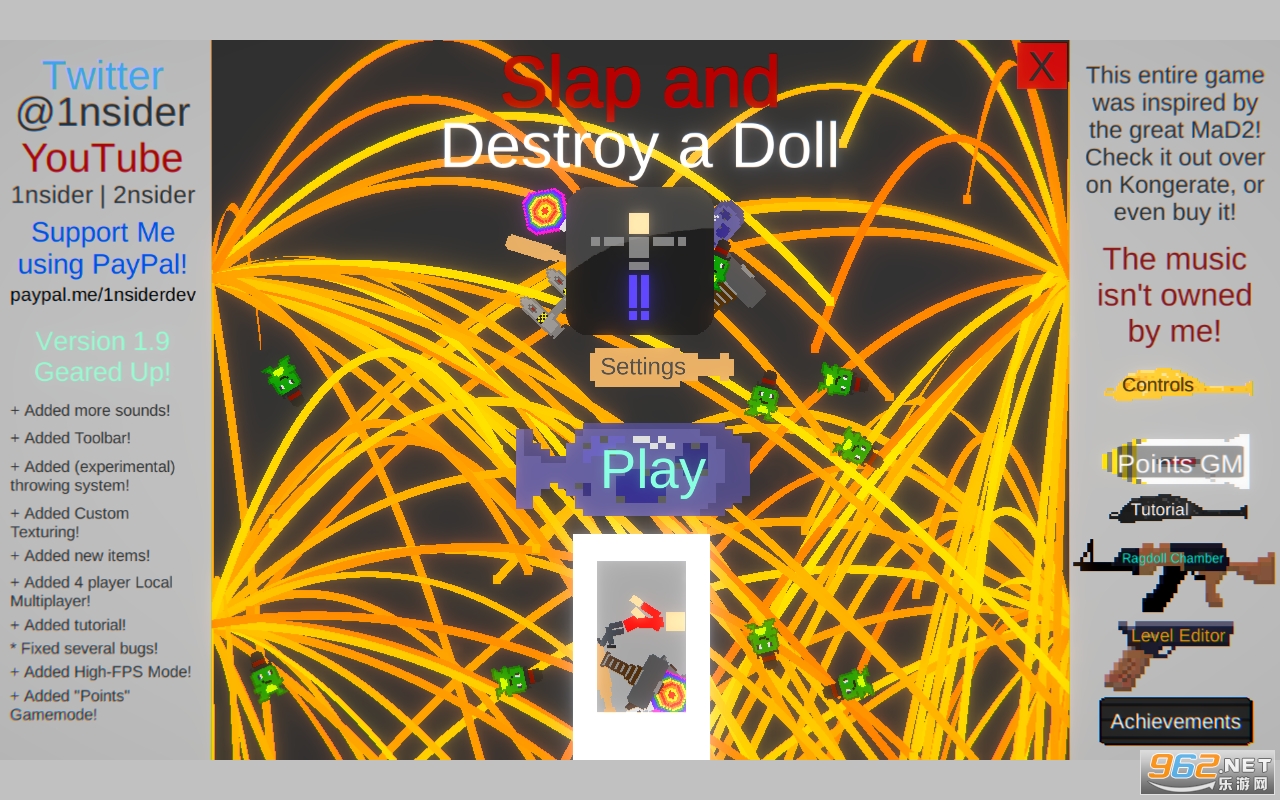 恶意破坏娃娃是一款沙盒游戏,专注于撕裂和扔布娃娃。有各种各样的物品,从帽子到枪支,您可以用来装饰或攻击布娃娃。它有一个完全配音的教程,关卡编辑器,并具有2名玩家的潜力!