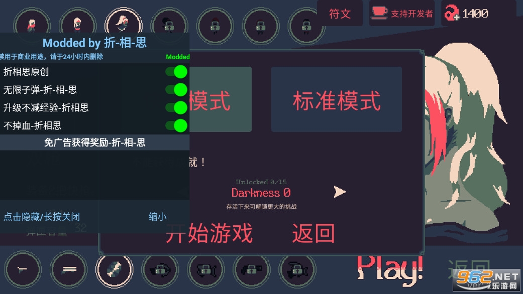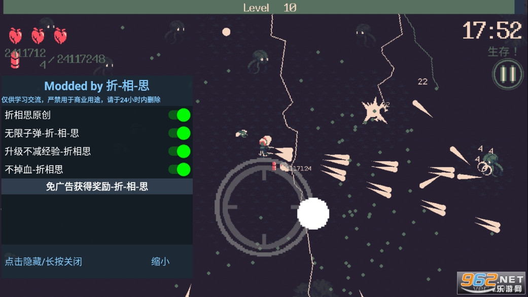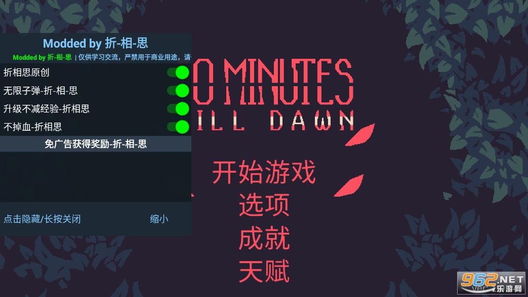 黎明前20分钟免广告破解版下载,手机版,免广告获得勾玉,内置菜单,有着无敌无限子弹等作弊功能,《黎明前20分钟》是一款像素风格的带有roguelike元素的射击冒险手游,游戏加入了众多的英雄,还有着双枪、散弹枪等众多武器可以解锁体验,玩家需要控制角色灵活走位,去消灭出现的大量怪物,注意合理的升级技能来打败强大的敌人。