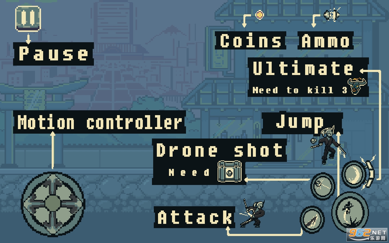 武士的武器:武士可以使用剑进行攻击,还可以使用无人机朋友的帮助来应对敌人的攻击。
