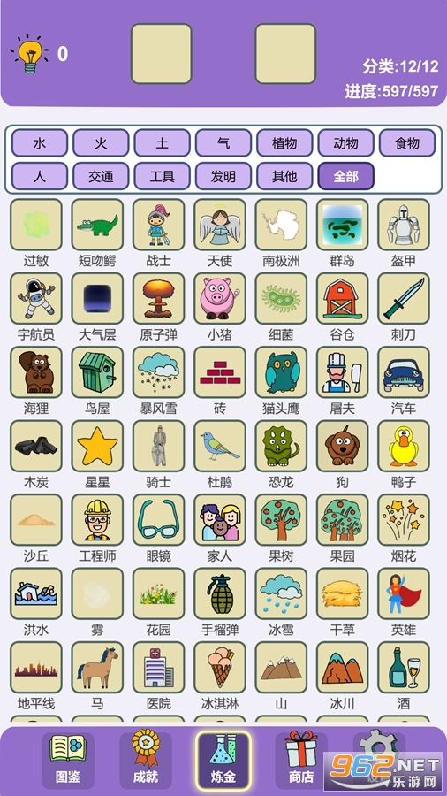 《简单的炼金术》是一款合成类游戏。在游戏中您将扮演炼金术士,通过对四种基本元素进行炼金,从零开始创造宇宙中的森罗万象。您所需要的,只是一颗不断探索世界的好奇心。本游戏采用了两两合成的游戏玩法,游戏最初只有“土”“水”“空气”“火”四种基本元素,组合这些元素并创建新的元素。不断混合和开放元素,创造更多元素。运用逻辑和想象力,有些反应相当艰难。为惊喜做好准备!