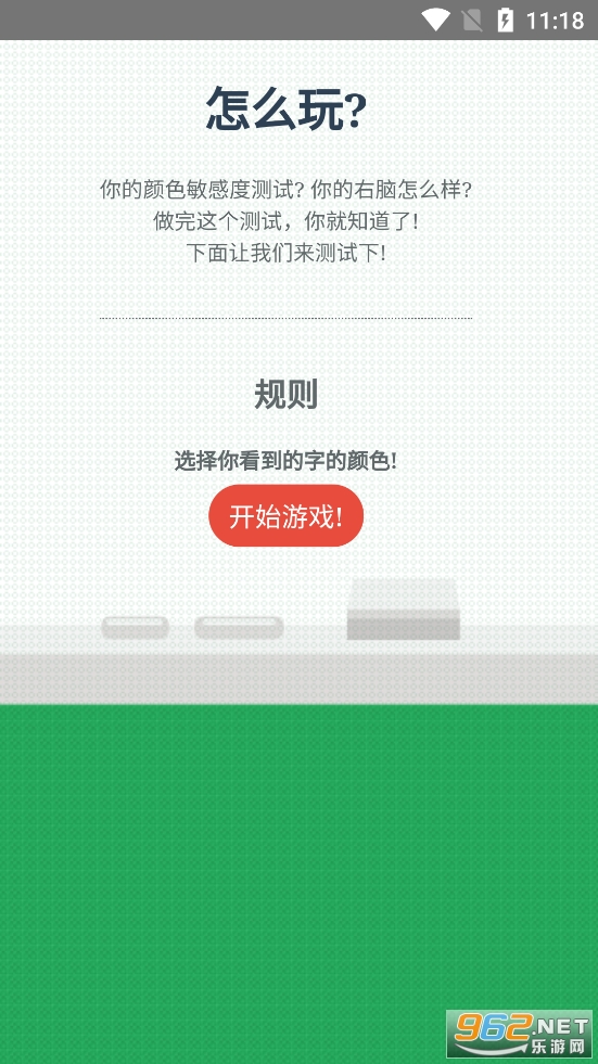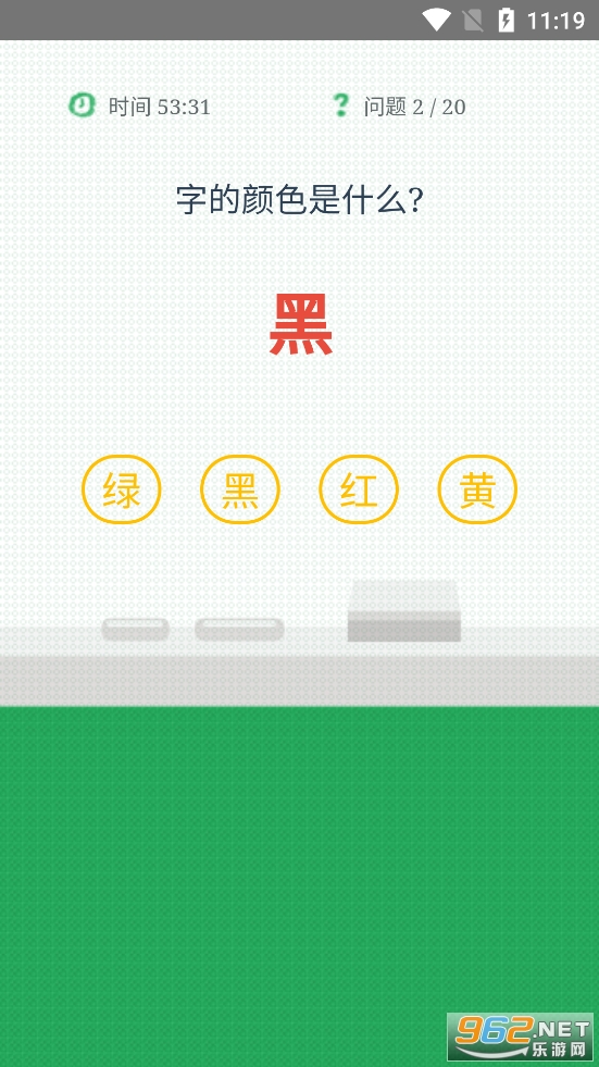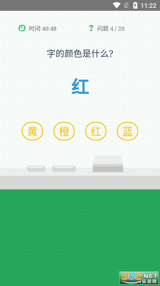游戏难度还是有点的,有着时间限制,只有1分钟,而且有着20个题目,给出的字的意思和字的颜色有时候一样有时候不一样,玩家需要快速的选择正确的字的颜色,有需要的朋友可以下载试试。