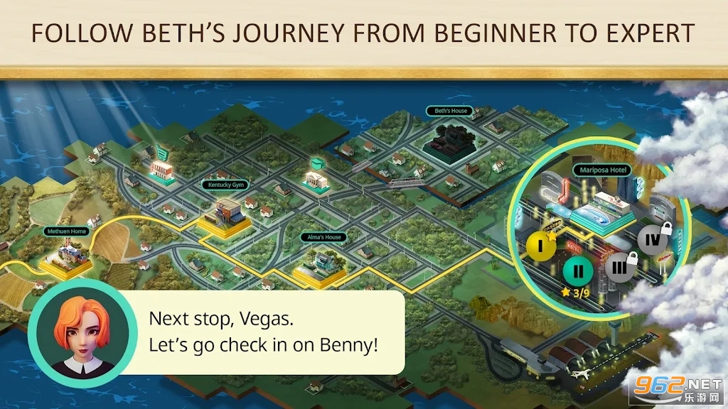 &8226; 与 Shaibel 先生一起学习国际象棋,与 Borgov 一起参加国际象棋比赛,或在公园里与 Beth 进行比赛挑战。将死。