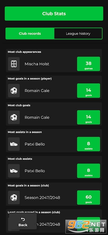 随着时间的推移,球员会来来去去,但真正的传奇人物将永远留在俱乐部记录菜单上。跟踪您出场次数最多的球员、历史上最佳射手以及最昂贵的签约和销售。建立具有真正个性的足球俱乐部。