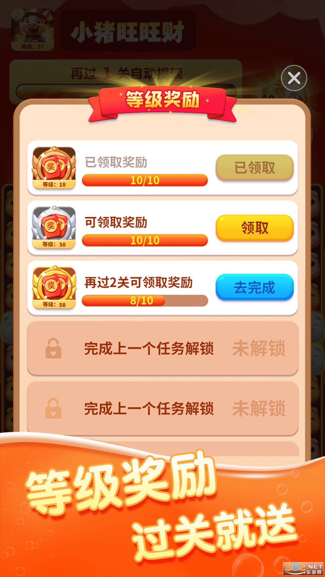 在关卡中进行消除挑战,完成任务获得丰厚的红包奖励,解锁更多关卡进行挑战,获得更多红包。