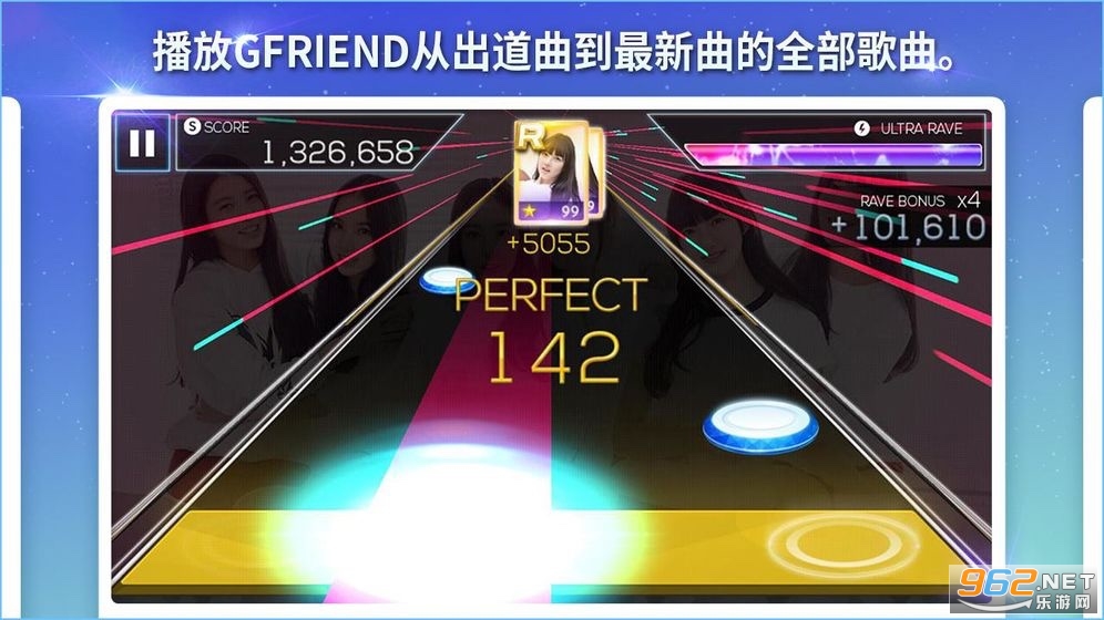 游戏中拥有海量的歌曲可以让大家来太早,丰富的玩法元素,简单的游戏操作,不同的玩法模式,让大家在游戏中边挑战边欣赏GFRIEND的歌曲,和你喜欢的偶像亲密互动!