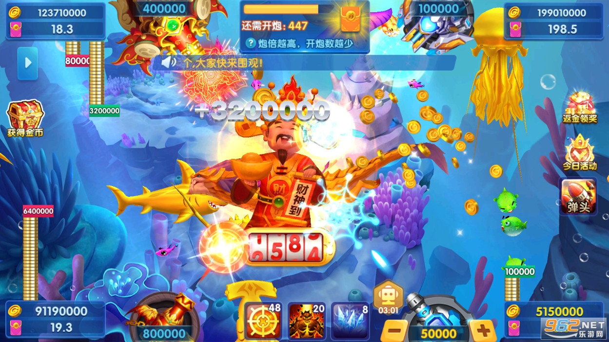 多样技能,多种炮台,丰富玩法,奖金鱼,章鱼BOSS,食人鱼BOSS,切水果,消消乐,连连看,贪吃蛇,花样鱼阵变换,万倍BOSS来袭,多种休闲社交玩法满足同屏爆金体验。