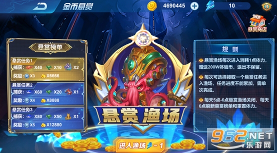 独创海怪渔场,设置了机械蟹王、万年巨鳄、深海鮟鱇、史前海怪等超炫场景,蟹王、巨鳄、鮟鱇、史前章鱼等高倍BOSS盘踞海底,让玩家体验不一样的捕鱼乐趣!