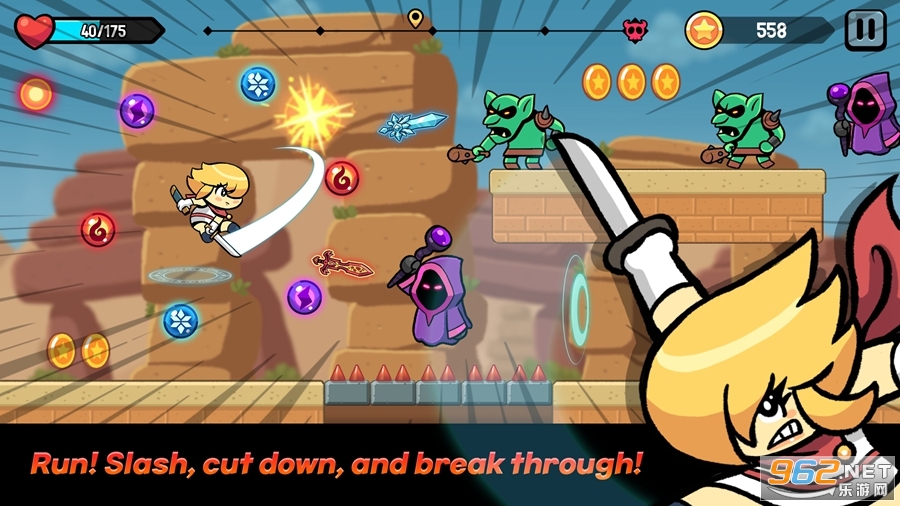 趣味的跑酷与战斗游戏,边跑酷变战斗,需要玩家敏捷的控制角色奔跑跳跃和下滑,避开各种危险,击杀拦路的各种怪物,跑的越远获得的奖励越高,喜欢的朋友可以下载试试。