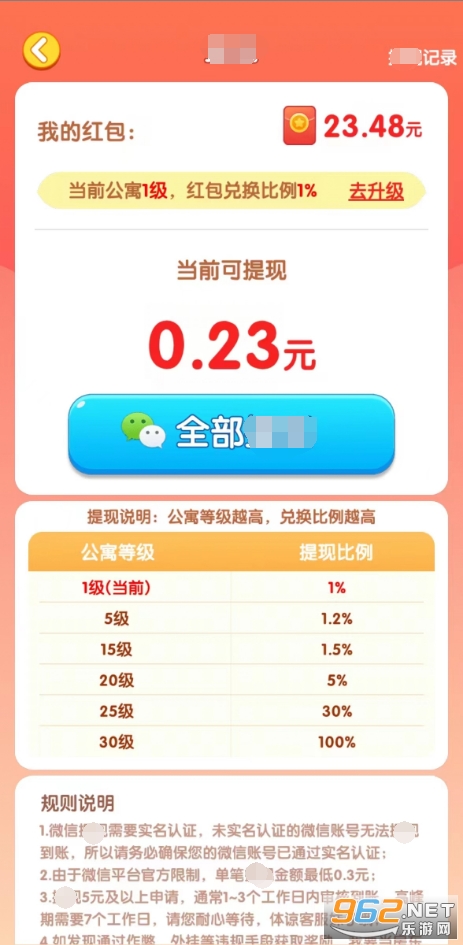 红包按百分之一比例全部提现。