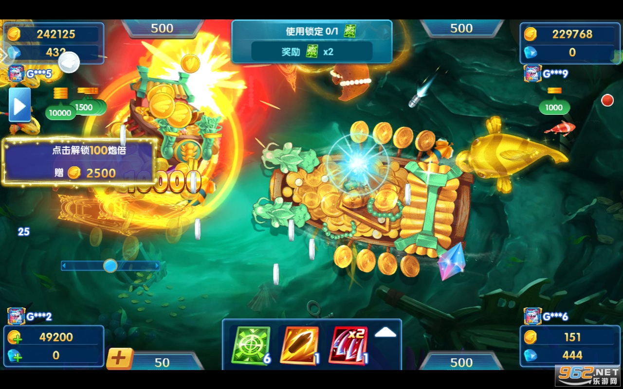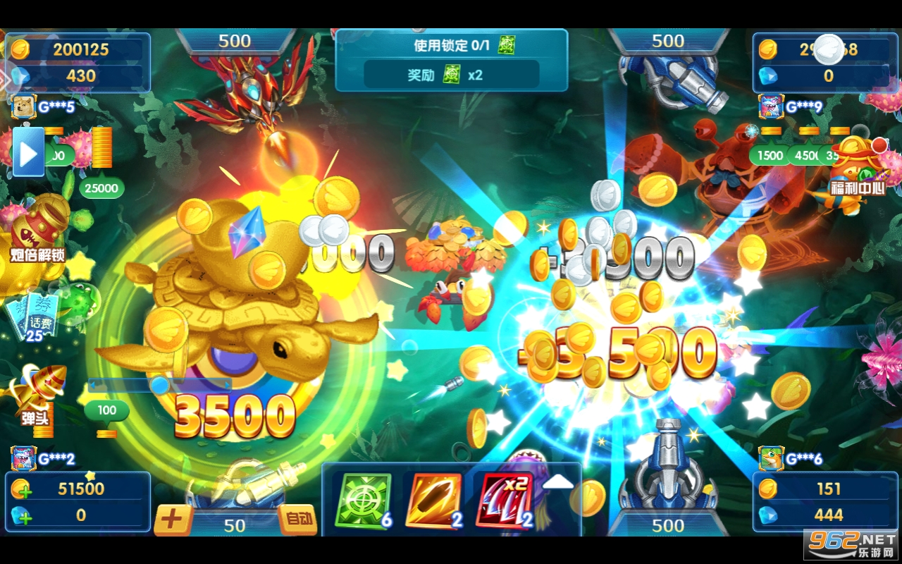 6、子弹无限反弹,锁定、冰冻、狂暴、神灯等道具,带给您不一样的捕鱼乐趣!