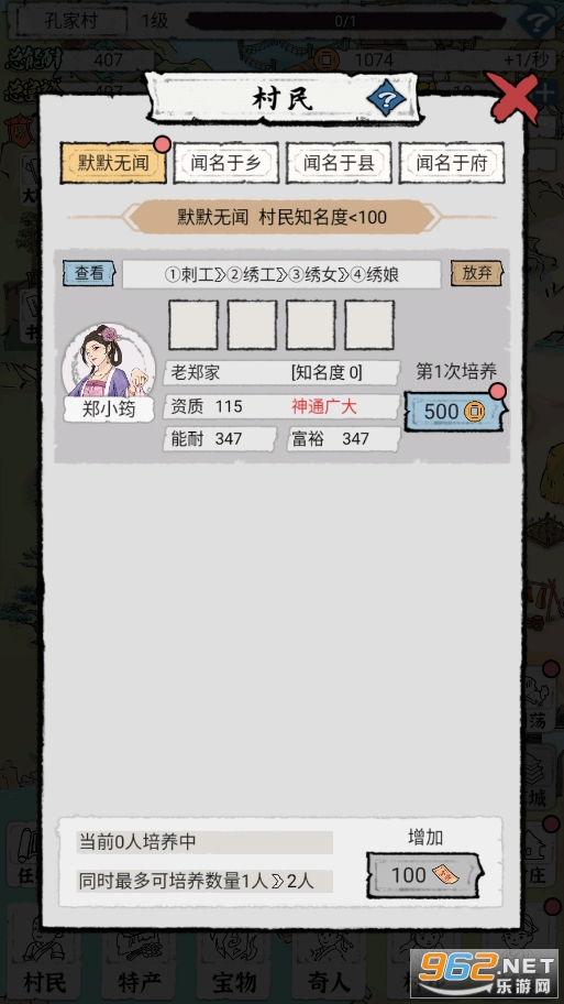 4、村花村草:我目前里面的人物等级都点满了,追求这一块我也不是特懂,我这边的成功率都是10%,基本上追求都是失败,只成功过两次,失败之后就是撮合,我都是选择那个要花金元宝的,而且撮合的对象最好是紫色往上的,这样加的能耐就越高,像绿色的蓝色的最好是放弃掉,毕竟撮合成功一次,后面的成功率就低了。