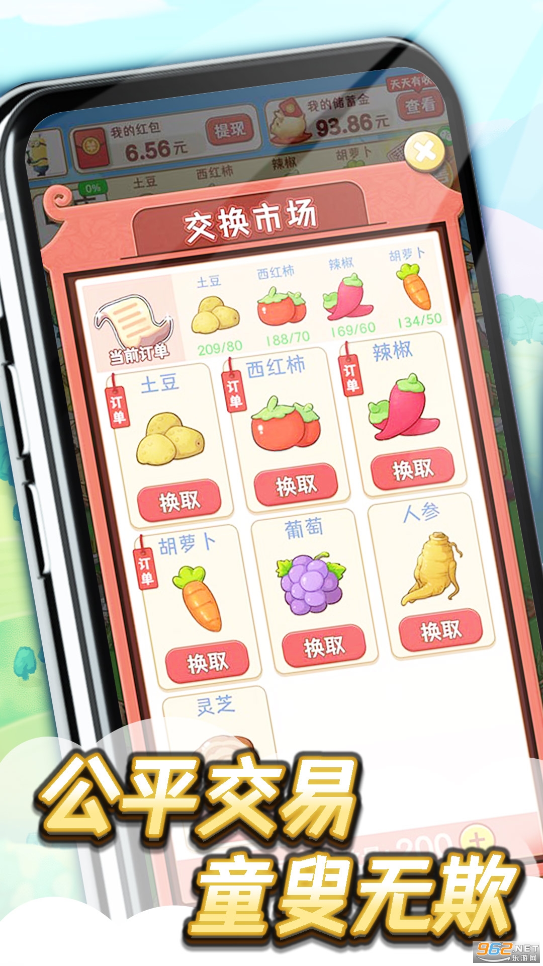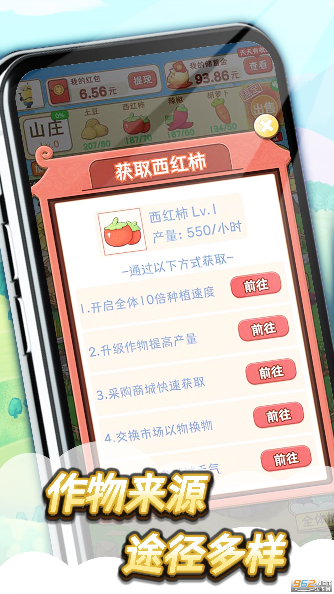 好玩的模拟经营养成游戏,游戏整体采用3D精美卡通画风,悠悠山庄红包版游戏中各种各样不同类型的植物玩家都可以在农田中进行种植,这些等到成长后可以进行售卖获得大量的金钱,玩家在游戏中可以使用金钱开辟更多的农田,还有种植任务完成后就会有红包。