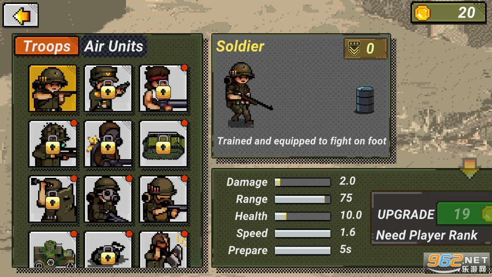 像素风的动作射击游戏。以战争为题作的冒险策略游戏,在这里有着精彩的战役模式等你挑战,在战场上进行排兵布阵感受丰富的战斗特色,招募更多的士兵来为你侵略掠夺,不同的士兵功能还不太一样,你可以自由的进行选择安排。
