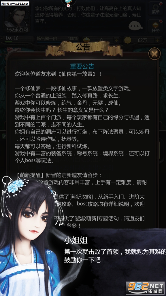 《仙侠第一放置兑换码》是一款非常火爆的文字修仙类手游,简单的游戏玩法,轻松的游戏,只需要挂机操作即可,就算游戏离线了也可以帮助用户自动挂机刷副本,感兴趣的朋友快来962下载吧!