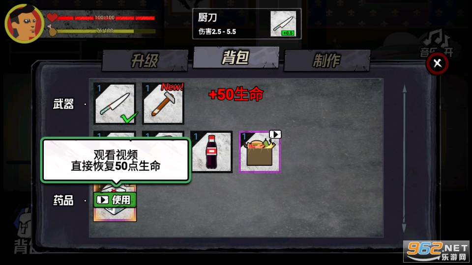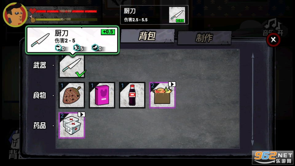 食物可以直接食用,也可以通过厨房制作成其他的高级食物,可以天呈恢复饥饿;药品也同样,可以直接使用或者制作成其他药品;材料主要用来升级工作台以及武器的制作