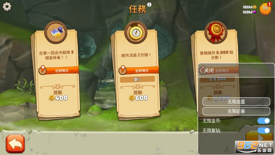 1、设置中文方式:进入游戏,弹出“Terms and Conditions”弹窗-->点击下方“ACCEPT”,进入游戏主菜单界面-->点击左上角“设置”图标,进入“菜单”界面-->点击“LANGUAGE”选项下方的“ENGLISH”,进入“LANGUAGE”界面-->点击下方“繁體中文”,连续点击右上角“x”即可。