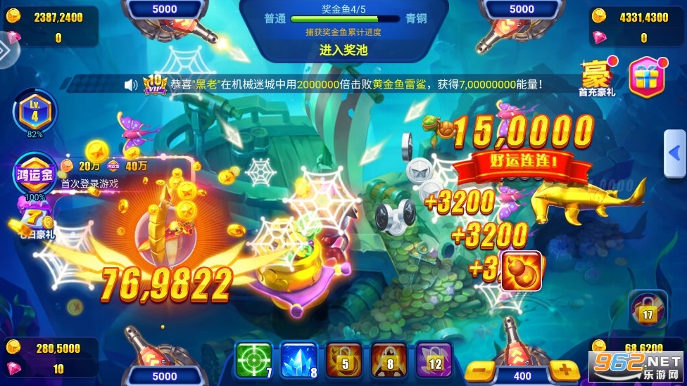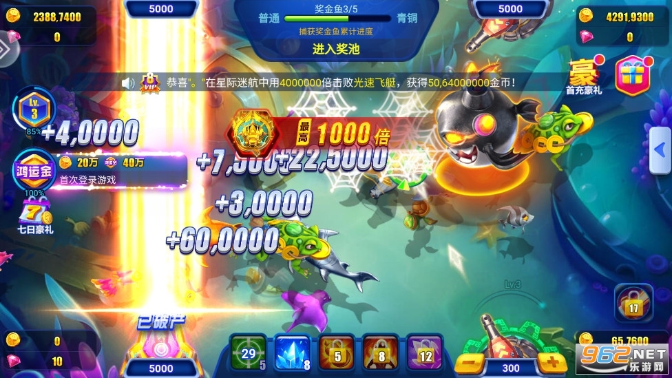 《捕鱼达人2》是一款好玩的手机捕鱼游戏,有着大量的鱼儿登场,玩家可以解锁各种强力的炮台去捕捞鱼儿,可以升级强化,去捕捞各种各样的boss,获得丰厚的金币奖励。