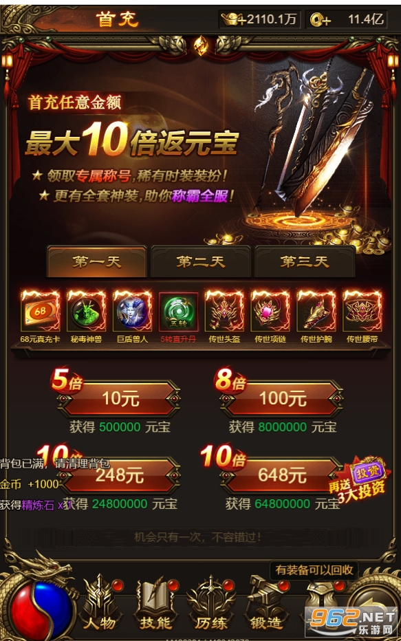 ★后缀说明:游戏内置余额宝功能,可通过日常活动,击杀boss获得直充无限提取充值额度,并计入累充活动!