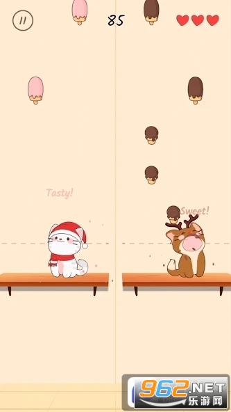 2、游戏中,玩家需要点击屏幕让两只猫咪吃到事食物,食物是不可以掉落的;