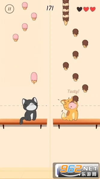 2、游戏中,玩家需要点击屏幕让两只猫咪吃到事食物,食物是不可以掉落的;