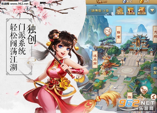 江湖自古风云涌,武林从来不寂寞!游戏内更有华山论剑、武林大会、血战襄阳、藏兵阁夺宝、天下第一门等各种丰富的战斗玩法,让你品味武侠世界的荡气回肠!同时亦能开宗立派自立山门,开启丰富的门派玩法,享受经营的乐趣!