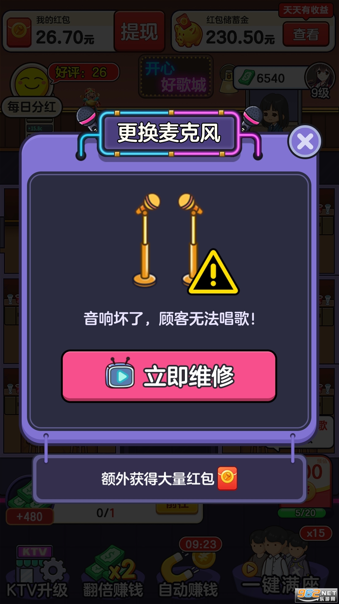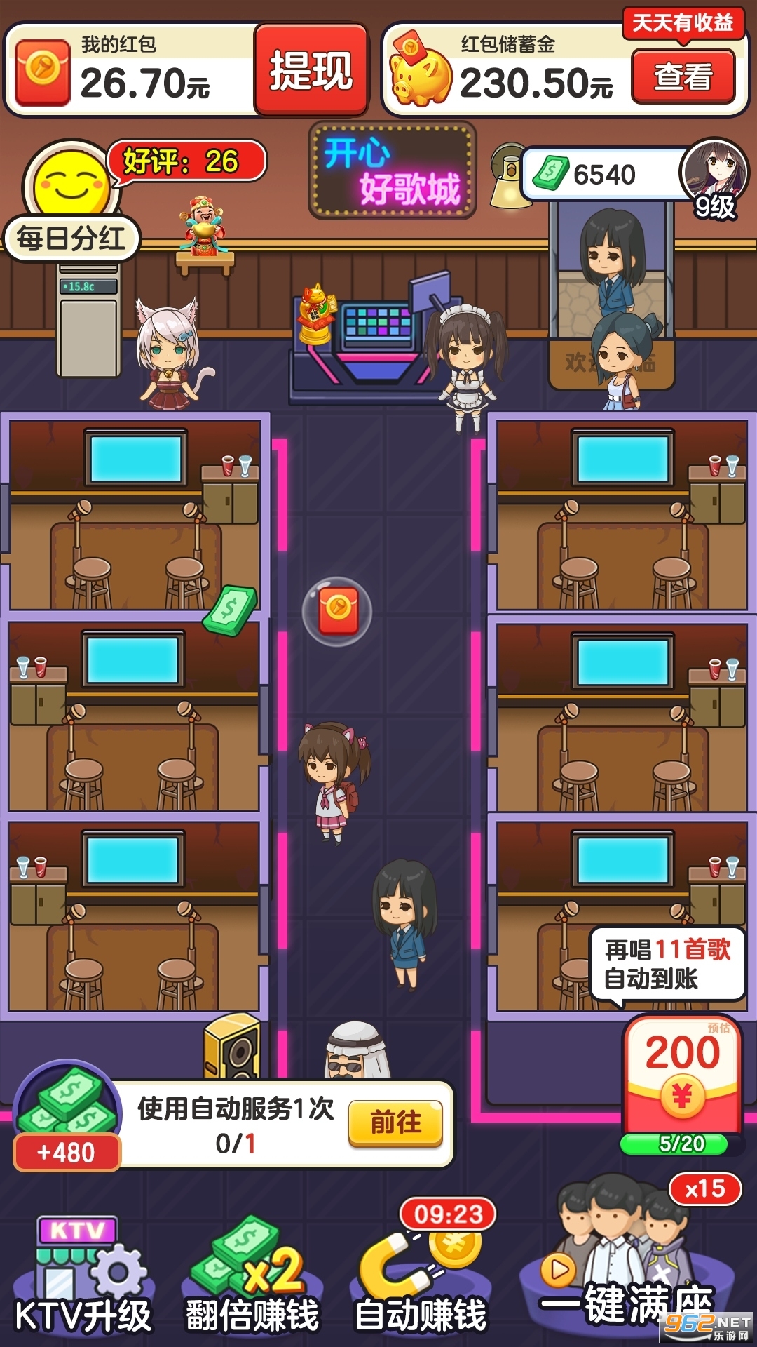 开心好歌城能领红包吗,这里经营一家KTV,K歌赚钱,升级你的KTV解锁红包福利,招揽生意接待一个个客人,升级KTV设施,完成你的订单,赚取超多福利。