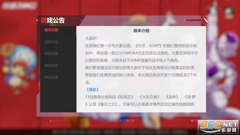 代号jump官方正版手游集结了大量漫画中的人气角色、像《海贼王》、《火影忍者》、《死神》等主要角色,都将悉数登场,而我们也将与这些角色一起共同完成,不同难度的下的游戏挑战,匹配更多的真人玩家们,与他们进行多人乱斗作战,并成功的击败对手,赢下比赛的最终胜利。