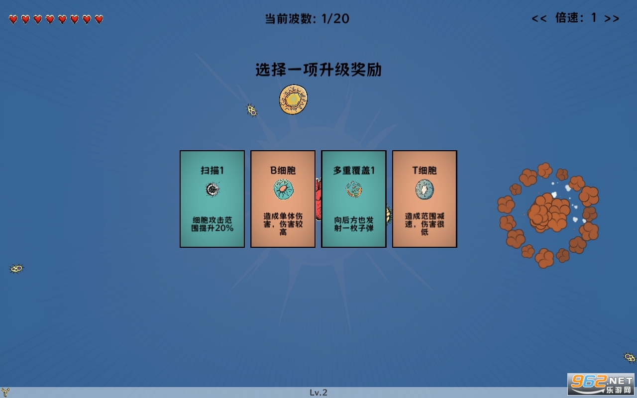 《细胞防线破解版内置修改器》是由独立游戏制作烛光工作室运用gpt打造的一款rougelite的塔防休闲游戏,游戏玩法相对简单,玩家需要通过各种身体内的免疫细胞防御塔,从各类外来病原体的攻势下守护具有三点生命值的心脏。击杀病原体能够获得经验升级,每次升级都能够获得随机强化,挺过足够波次的攻势就能获得胜利。